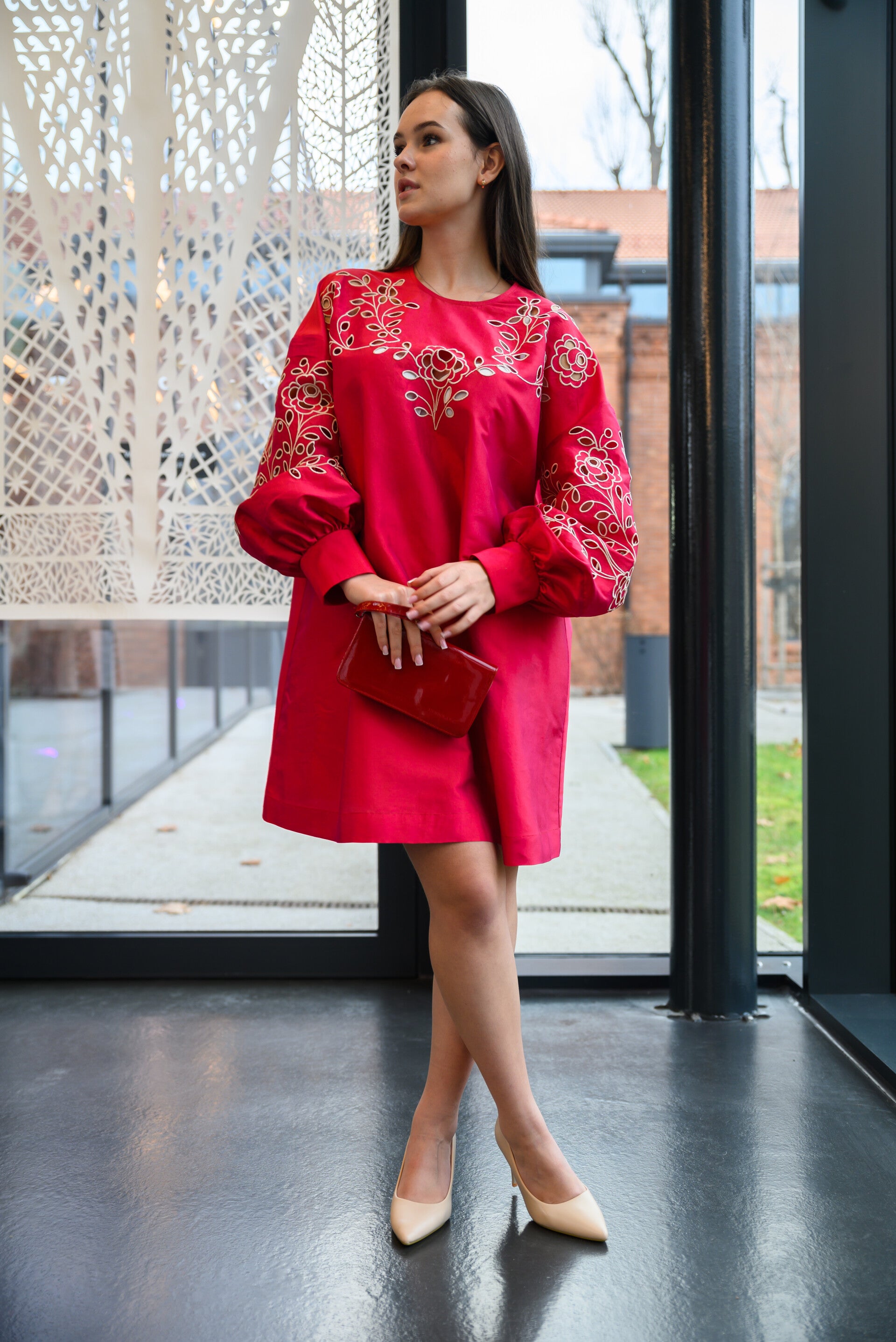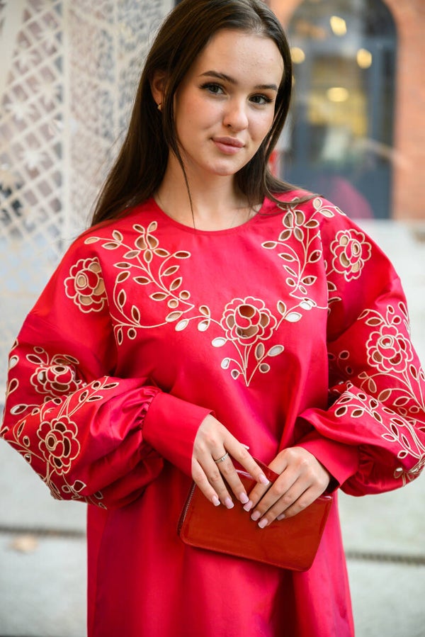 Red dupioni silk embroidered dress with hand cut richelieu. Beige floral embroidery.