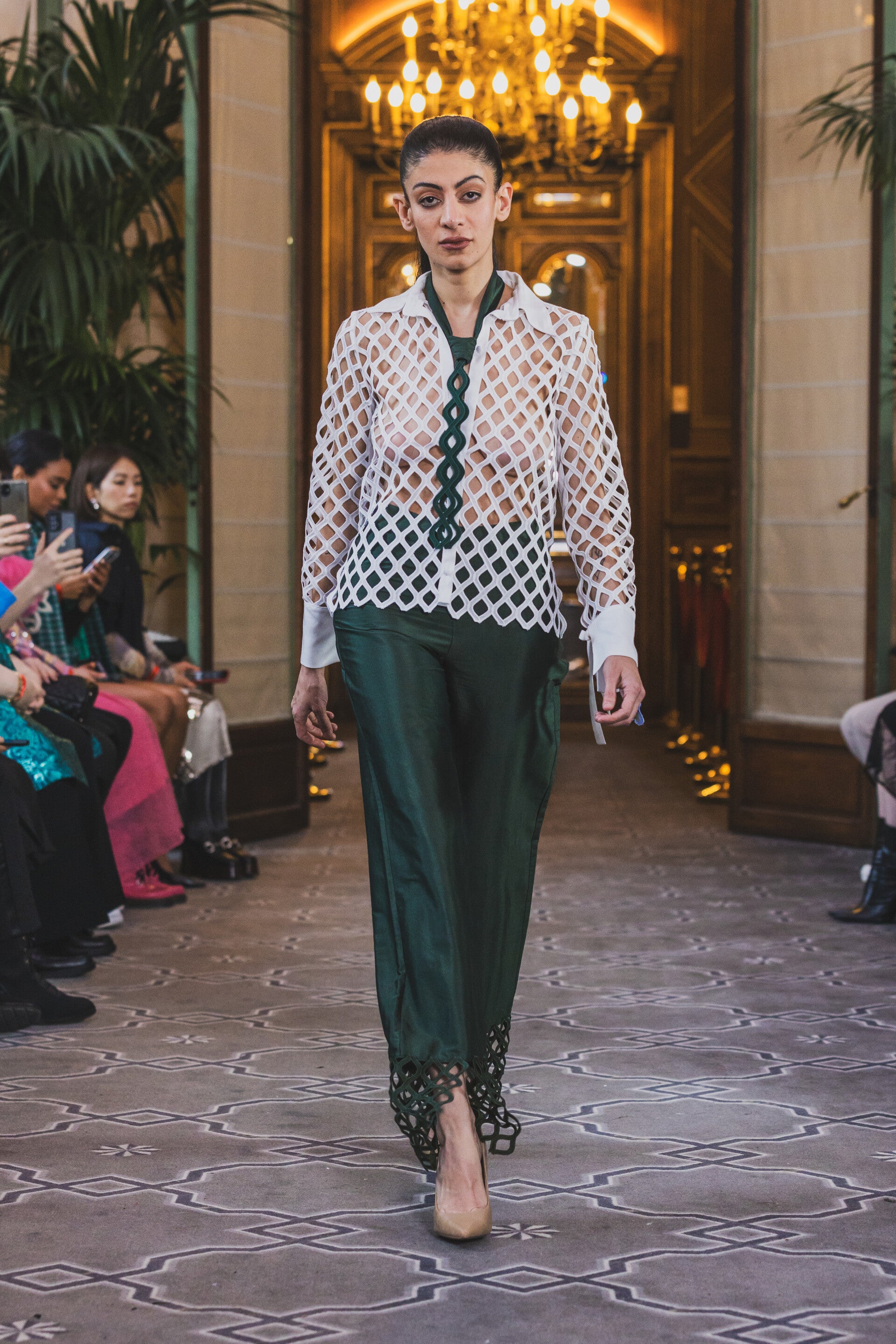 Dark green silk pants tencel ivory top with hand cut embroidery Richelieu.