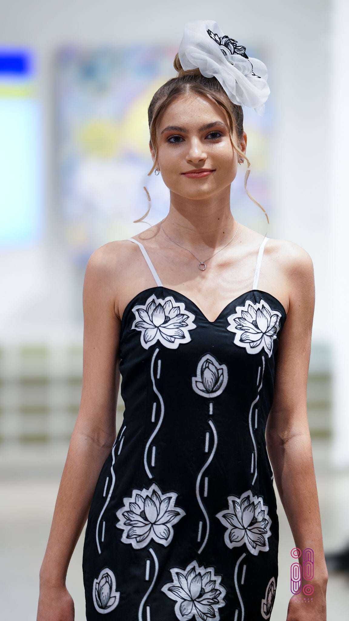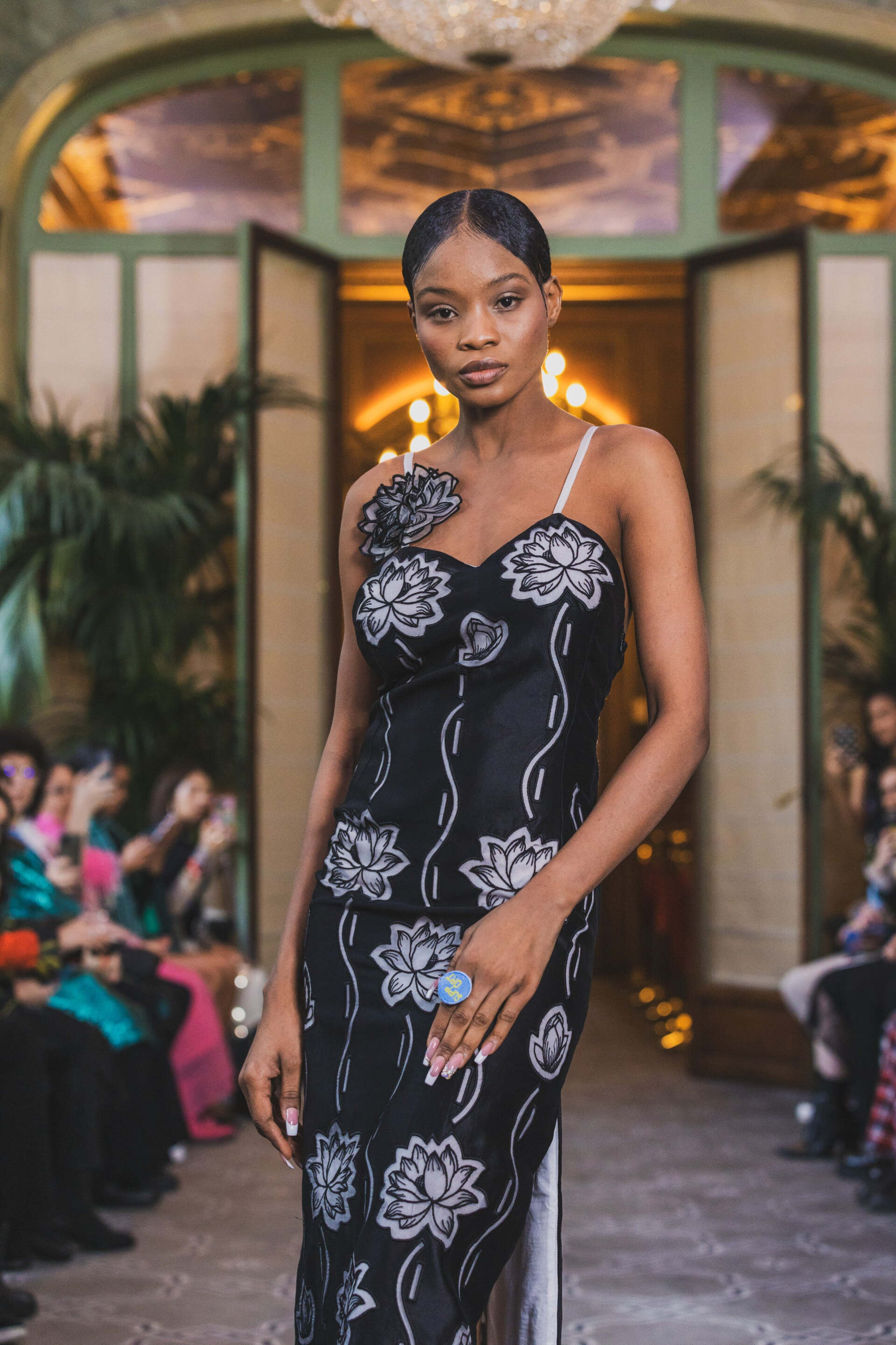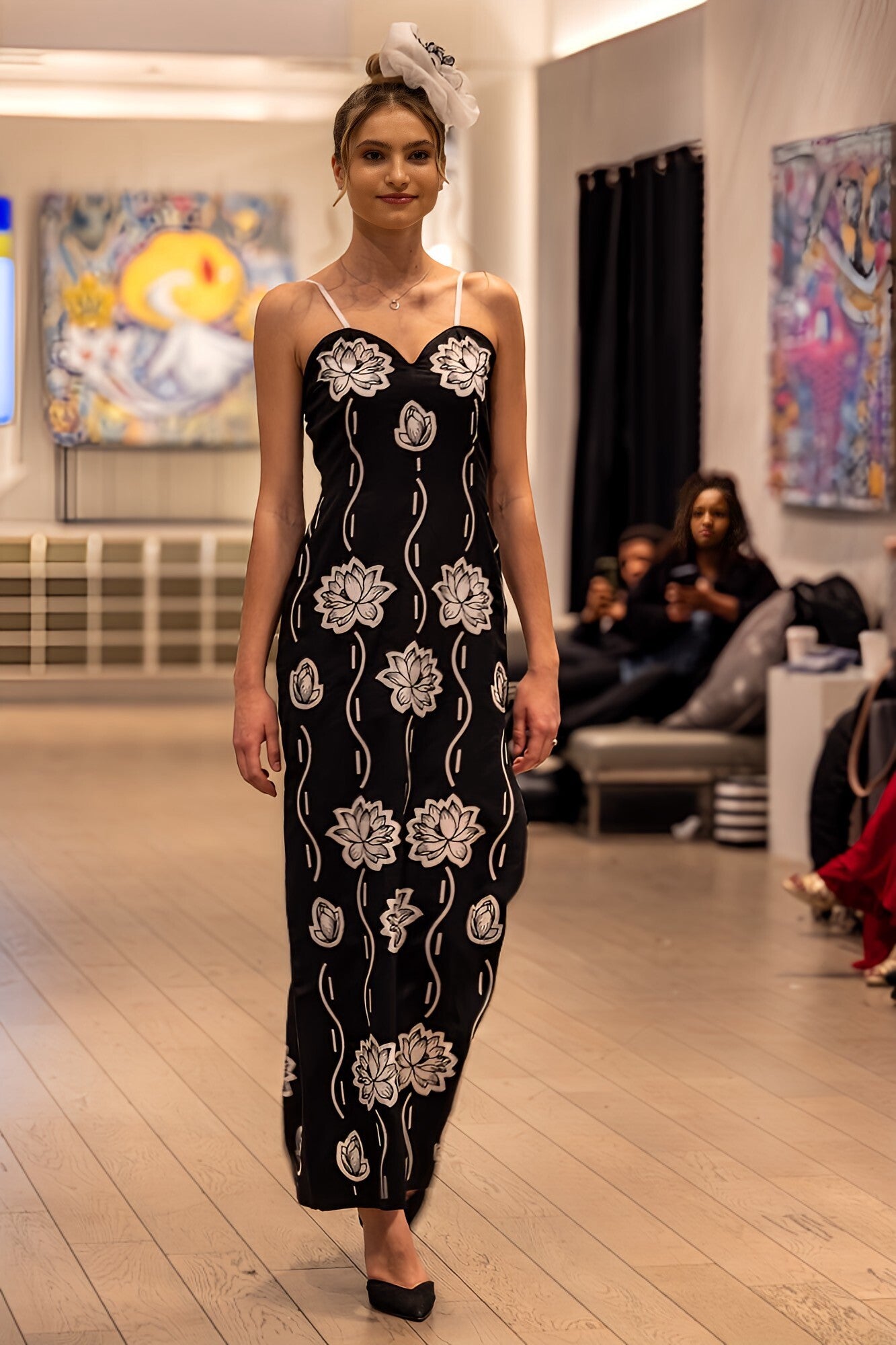 Gourgeus long black tencel dress with hand cut appliques. Beautiful water lilies on front and back of the dress.